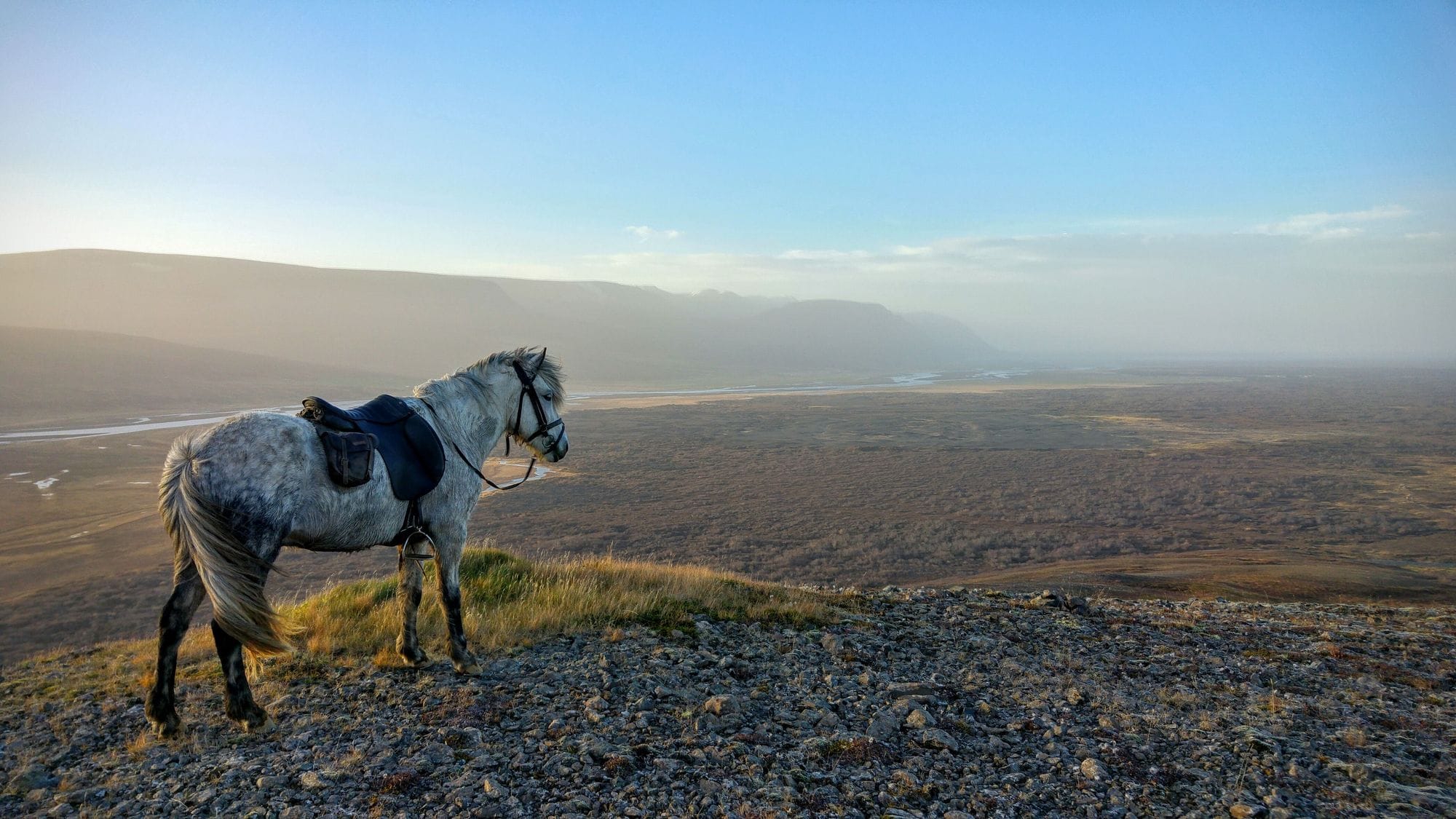At the top, the trail continues behind the mountain, where silence and stillness take over. Here, you ride through a landscape shaped by Arctic vegetation, passing through Krubbskálar — a quiet, scenic valley framed by rugged ridgelines. The track alternates between smooth dirt paths and firmer gravel stretches, with occasional rocky sections that challenge your focus and rhythm.