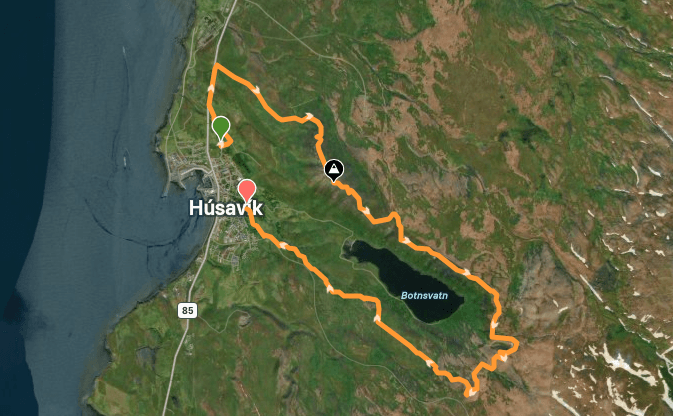 The route from downtown Húsavík, to Húsavík Mountain, to Krubbskálar with a stop by Lake Botnsvatn before returning downtown
